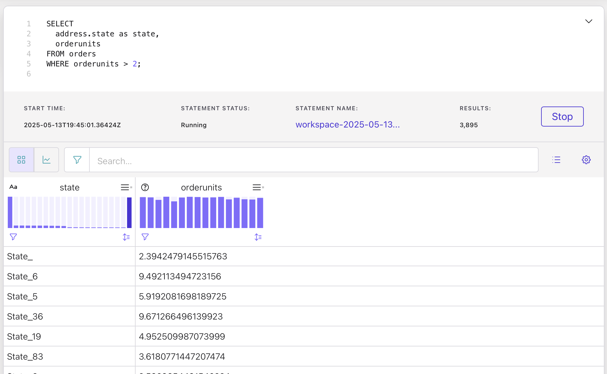 Did you notice the row counter in the top-right of your SQL cell? it keeps climbing because you’re running a continuous, never-ending streaming query. Although you’re now seeing the results you want, they exist only in this session: once you close the screen, the query will stop and the data will vanish. To make your filtering and projection permanent, wrap your statement in a CREATE TABLE ... AS clause. That way Confluent Cloud will create a persistent query that will feed a live materialized table, preserving your results even after you close the SQL workspace.